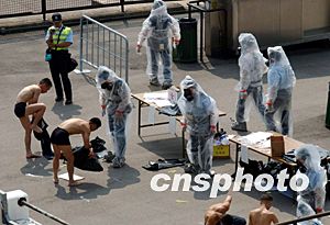 警方?jīng)_鋒隊(duì)為受到毒氣襲擊的傷者現(xiàn)場消毒清洗。中新社記者:洪少葵