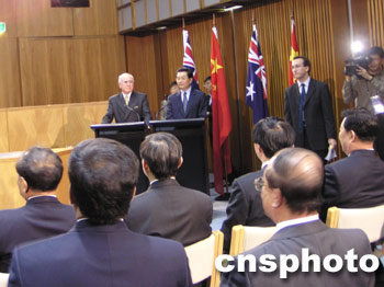 中國國家主席胡錦濤和澳大利亞總理霍華德10月24日在聯(lián)邦大廈聯(lián)合會見中澳記者。作者:劉雨生