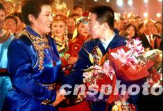 二十四日晚,北京舉行大型文藝晚會(huì)《圓夢(mèng)》慶祝中國首次航天飛行圓滿成功。著名歌唱家德德瑪代表觀眾向航天英雄楊利偉獻(xiàn)花。作者:王玉