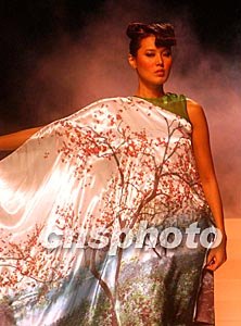 參加中國新絲路世界模特大賽的各國佳麗,十月二十八日在杭州西湖畔的晚會(huì)上展示西湖春色的絲綢服飾。中新社記者:賈國榮