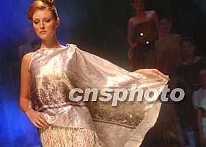 參加中國新絲路世界模特大賽的各國佳麗,十月二十八日在杭州西湖畔的晚會(huì)上展示西湖金秋湖光山色的絲綢服飾。中新社記者:賈國榮