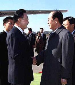 朝鮮最高人民會議常任委員會委員長金永南在機(jī)場迎候吳邦國一行。機(jī)場上舉行了隆重的歡迎儀式,朝鮮軍樂隊高奏中朝兩國國歌,在金永南的陪同下,吳邦國檢閱了朝鮮人民軍陸?杖妰x仗隊。