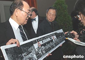 美東時間十月二十九日中午,紐約法蘭克坎貝爾殯儀館內(nèi)舉行公祭活動,悼念蔣介石的遺孀宋美齡女士十月二十三日晚在紐約逝世。圖為國民革命軍遺族學(xué)校同學(xué)會北美分會會長向厚祿在殯儀館外,手捧舊照,回憶一九五○年十一月蔣介石、宋美齡夫婦參加該校三十周年校慶時的情景。作者:龔文謨