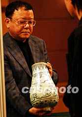 中國嘉德2003秋季拍賣會將于十一月舉行,十月三十日,眾多將拍賣的文物珍品開始在北京進行預(yù)展,著名影視演員王剛到現(xiàn)場探察拍賣品情況并對一款明清時代的青花瓷瓶仔細鑒賞。中新社記者:王麗南