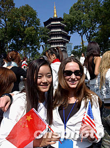 參加新絲路世界模特大賽的中美兩國(guó)小姐,十月三十日共同游覽杭州雷峰塔并一起合影留念。中新社記者:賈國(guó)榮
