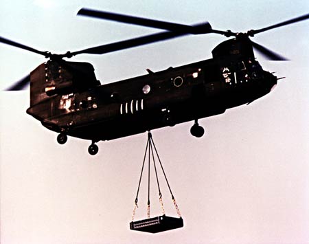 CH-47是標(biāo)準(zhǔn)的中型運(yùn)輸直升機(jī),它開發(fā)于1958年,設(shè)計要求能將2.7噸物資運(yùn)到185千米處,并重新搭載1.35噸物資不補(bǔ)加燃油飛回原出發(fā)點(diǎn);驊(yīng)能在機(jī)外吊掛7噸物資飛到37千米外的地方卸下,并不加油飛返原地。經(jīng)競爭,波音伏托直升機(jī)公司的伏托114型方案中標(biāo),并以HC-1的舊稱號投入試制。1961年9月原型機(jī)YHC-1B試飛(后改稱CH-47A)。1962年8月服役,至今仍在生產(chǎn)、改進(jìn)和使用中。估計總產(chǎn)量為800架左右,其中有58架出口英國、加拿大和西班牙。日本仿制的型號尚未包括在內(nèi)。H-47是一種縱列雙旋翼直升機(jī),近短形截面的機(jī)身頭部是駕駛艙,中段是長9.15米、高1.98米的大型主艙,可容44名士兵或27名傘兵或24副擔(dān)架,地板上設(shè)系留點(diǎn)91個,可一次運(yùn)輸一套戰(zhàn)術(shù)地對地導(dǎo)彈或2輛吉普車。為此,機(jī)尾是兼作跳板的向下翻的貨艙門,裝卸極為方便。