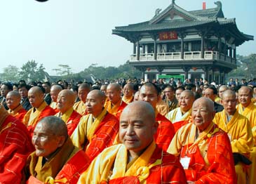 昨天在大明寺棲靈塔下舉行了盛大的紀念大會。來自國家、江蘇省有關(guān)方面的官員,鑒真東渡經(jīng)過及學(xué)習過的寺廟之諸山長老法師及港澳臺和日本的客人數(shù)千人參加了大會。紀念大會由揚州市委副書記、常務(wù)副市長洪錦華主持,中央統(tǒng)戰(zhàn)部副部長朱維群、國家宗教事務(wù)局局長葉小文、中日友好協(xié)會副會長文遲、中國佛教協(xié)會副會長學(xué)誠法師、江蘇省副省長何權(quán)、省委統(tǒng)戰(zhàn)部副部長、省宗教事務(wù)局局長翁振進、省臺辦副主任潘朗哉、省對外友協(xié)副會長、省佛教協(xié)會會長明學(xué)法師、日本駐滬總領(lǐng)事杉本信行、日本奈良唐招提寺益田快范長老、臺灣佛光山開山宗長星云、香港大學(xué)副校長、中國工程院院士李焯芬,揚州市府官員孫志軍、季建業(yè)、徐益民等參加了大會。