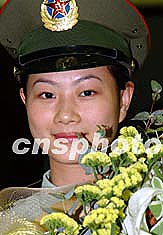 圖為駐港部隊女兵向楊利偉獻花。