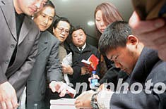 十一月五日,毛澤東之孫毛新宇在北京王府井書店為購(gòu)買《爺爺毛澤東》一書的讀者簽名。毛新宇以一個(gè)親人的獨(dú)特視角抒寫了對(duì)爺爺?shù)恼鎿辞楦,表達(dá)了對(duì)毛澤東的懷念。中新社記者:史利