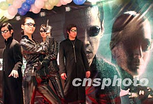 美國傳奇巨片《黑客帝國:矩陣革命》十一月五日晚十點整,在內(nèi)地的三十余個城市的近百家影院亮相,僅在北京的十余家影院中,就有數(shù)千“駭客迷”們與全球的“駭客迷”們一起成為該片的首批觀眾。這是中國引進大片實現(xiàn)全球同步的第一次。十一月五日晚該片北京首映式上,模特模仿片中人物形象以一身黑衣扮酷。中新社記者:張勤