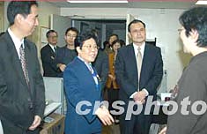 美東時間十一月六日上午,正在紐約訪問的中國國務(wù)院僑務(wù)辦公室主任陳玉杰(左二)在中國駐紐約總領(lǐng)事劉碧偉(右二)陪同下,來到美國《僑報》編輯部,看望采編人員。中新社記者:陳建