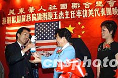 美東時間十一月六日晚,正在紐約訪問的中國國務(wù)院僑務(wù)辦公室主任陳玉杰出席了美東各界華僑華人為她率領(lǐng)的國僑辦代表團舉行的聯(lián)合歡迎宴會席間,國僑辦主任陳玉杰向紐約僑胞贈神舟五號飛船模型。中新社記者:陳建