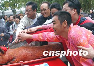 影片公司高層人士向華強在拜神儀式上。 中新社記者:錢興強