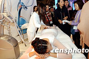 在香港舉行的“2003亞太區(qū)美容展”上,香港菲萊雅公司在現(xiàn)場(chǎng)推介美容和瘦身療法,吸引眾多愛(ài)美女士圍觀。中新社記者:洪少葵