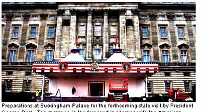 與此同時(shí),英國人的抗議活動(dòng)逐漸升級。昨天傍晚,警方逮捕了一名爬上白金漢宮大門的抗議者。她名叫林迪斯·普爾西,她在下午四點(diǎn)鐘的時(shí)候爬上大門把一幅美國國旗倒掛在上面。國旗上還寫著抗議布什訪英的標(biāo)語。她在被警方逮捕之前在大門上坐了兩個(gè)小時(shí)。