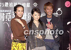 歌星莫文蔚、古天樂、關(guān)心妍11月18日在香港出席新城電臺廣播劇《尋覓3/4世紀幸褔鉆環(huán)》記者會,三位廣播劇主角獲贊助商贈送首飾打氣。作者:鄧慶樂