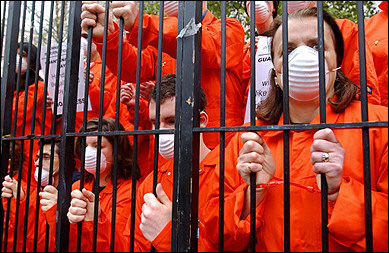 示威者扮成關(guān)塔那摩囚犯的模樣進行抗議。