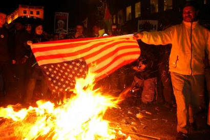 示威者焚燒美國國旗。