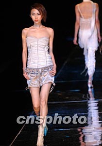 十一月二十五日晚,2003中國(guó)國(guó)際時(shí)裝周·房瑩2004春夏時(shí)裝發(fā)布會(huì)在北京中國(guó)大飯店舉行,設(shè)計(jì)師用明快的色彩、古青銅器上花紋一般紋理,讓觀眾感受經(jīng)典就是永恒。中新社記者:盛佳鵬