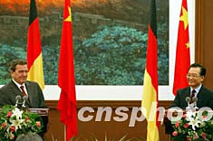 中國國務(wù)院總理溫家寶、德國總理施羅德十二月一日在出席中德雙方簽字儀式后,共同會見中外記者。中新社記者:滿會喬