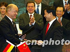 中德雙方十二月一日在北京簽署多個合作文本,中國總理溫家寶、德國總理施羅德共同出席簽字儀式。中新社記者:滿會喬