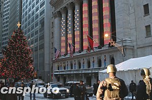 紐約證券交易所正門上方懸掛著中國(guó)國(guó)旗,準(zhǔn)備迎接首次訪美的中國(guó)總理溫家寶為周一股市開(kāi)盤(pán)鳴鐘。證交所門前警備森嚴(yán),警車重重。中新社記者 陳建 攝