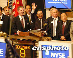 美東時(shí)間十二月八日上午,首次訪美的中國(guó)總理溫家寶來(lái)到紐約證券交易所,為周一股市九點(diǎn)半開(kāi)盤(pán)鳴鐘。中新社記者 陳建 攝