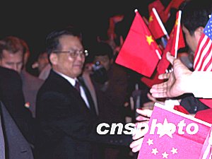 美國(guó)國(guó)務(wù)院禮賓司司長(zhǎng)埃斯納特、安德魯空軍基地空軍準(zhǔn)將格雷、美國(guó)國(guó)務(wù)院助理國(guó)務(wù)卿凱利到機(jī)場(chǎng)迎接。二百多名當(dāng)?shù)厝A人華僑和大使館工作人員也到機(jī)場(chǎng)熱烈歡迎溫家寶總理。