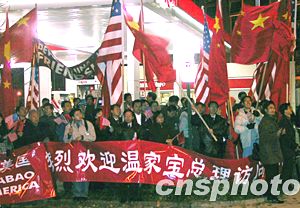 華盛頓僑界9日夜在溫家寶總理演講會場外集會,高呼“國家統(tǒng)一,反對分裂”口號。中新社記者:余東暉