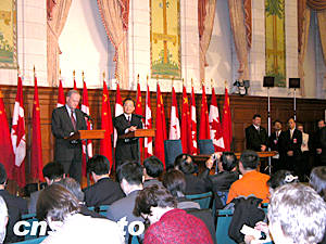 溫家寶總理與克雷蒂安總理舉行會(huì)談后共同會(huì)見記者。中新社記者:閆曉虹
