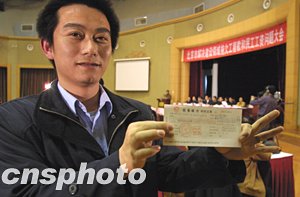 北京市政府十二日在京召開(kāi)“北京市解決建設(shè)領(lǐng)域拖欠工程款和民工工資問(wèn)題大會(huì)”,北京市建筑施工企業(yè)向外地進(jìn)京勞務(wù)企業(yè)集中兌付勞務(wù)費(fèi)12.6億元。南通某勞務(wù)公司代表手持現(xiàn)場(chǎng)兌付的150萬(wàn)元支票高興地向記者展示。中新社記者:廖文靜
