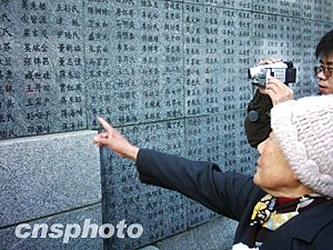 南京大屠殺幸存者夏淑琴十三日在南京“遇難者名單墻”前指認(rèn)親人名單。作者:丁梅