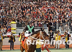 世界馬壇盛事──香港國(guó)際賽馬日十二月十四日在此間沙田馬場(chǎng)舉行,其包括香港杯、香港瓶、香港一哩錦標(biāo)、香港短途錦標(biāo)以及六場(chǎng)本地賽事,香港隊(duì)榮獲短途錦標(biāo)和一哩錦標(biāo)兩項(xiàng)桂冠。圖為香港“精英大師”獲短途錦標(biāo)頭馬后,受到全場(chǎng)馬迷歡呼。中新社記者:潘索菲