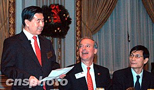 中國人壽董事長王憲章(左)向紐約證交所董事會臨時主席兼首席執(zhí)行官約翰·里德(中)、國壽上市案的全球聯(lián)席協(xié)調(diào)人——中國國際金融有限公司代表朱云來(右)等致辭。