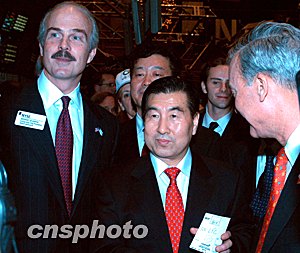 中國人壽董事長王憲章(中)在紐約證交所董事會臨時主席兼首席執(zhí)行官約翰·里德(右)等陪同下,在交易大廳中以首日開盤價二十三點二五美元,購買了一百股國壽股票。