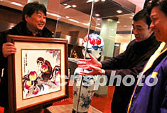 中國(guó)工藝美術(shù)師、陶瓷專家熊鋼如(左),十二月中旬在北京王府井景德鎮(zhèn)陶瓷城展示他的瓷畫“猴子與桃子”。隨著中國(guó)農(nóng)歷猴年的臨近,以猴為形象的工藝品與日俱增。中新社記者:王麗南