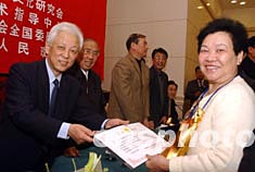 十二月二十二日,中國餐飲業(yè)最高獎項“伊尹獎”頒獎表彰大會在北京人民大會堂舉行,全國政協(xié)副主席周鐵農(nóng)(左)等向劉寶等二十八名獲獎?wù)哳C發(fā)了證書。中新社記者:武仲林