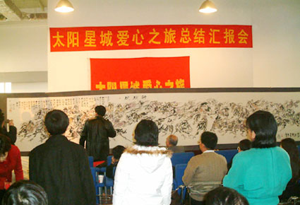 太陽星城愛心之旅隨團(tuán)著名畫家李繁民,傾心力作了八米巨畫《中華五十六駿圖》贈送給香港冠城集團(tuán),以表達(dá)對企業(yè)支持愛心事業(yè)謝意。石家莊殘聯(lián)理事長王金斗專程從河北趕來,代表石家莊市30萬殘疾人對太陽星城愛心之旅采訪團(tuán)的奉獻(xiàn)精神表示感謝。在報告會舉行之際,太陽星城愛心之旅所到之處的各級殘聯(lián)、志愿者組織和愛心人士發(fā)來了一百多封賀信。