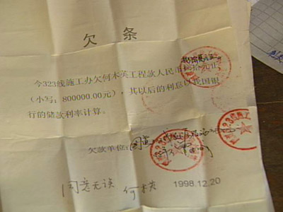 記者計(jì)算了一下,僅他們5位手中欠條上的欠款就達(dá)300多萬元,涉及到200多個(gè)民工的工資。據(jù)調(diào)查,323國(guó)道廣東乳源縣城段工程共拖欠民工工資達(dá)1300多萬元,涉及施工隊(duì)60多個(gè),民工670多人。拖欠時(shí)間長(zhǎng)達(dá)8年多。