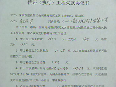 鄒遠(yuǎn)貴:“我追了八年債,我沒回過家。沒辦法回去,1997年我父親去世了,我哭了10次!睋(jù)他們介紹,這條路是1994年3月上馬的,當(dāng)時(shí)乳源縣政府以招商引資的方式引來廣西梧州明興房地產(chǎn)開發(fā)公司、深圳建設(shè)集團(tuán)公司珠海西區(qū)工區(qū),三方約定:工程總投資5800萬元,由甲方乳源縣政府以征地、拆遷等形式出資580萬元,乙方廣西梧州方出資1000萬元,丙方深圳珠海工區(qū)自籌其余工程款4220萬元,并以大包干的形式負(fù)責(zé)工程項(xiàng)目的全部施工建設(shè)。然而在實(shí)施過程中,資金卻出現(xiàn)了問題。