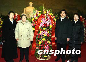 十二月二十六日上午,毛澤東的女兒李敏和她的女兒孔東梅(左一)、兒子孔継寧及兒媳到北京毛主席紀念堂獻花,紀念毛澤東誕辰110周年。中新社記者:任晨鳴