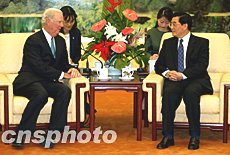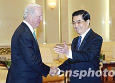 中新網(wǎng)12月29日電 據(jù)中國外交部消息,2003年12月29日下午,中國國家主席胡錦濤在人民大會堂會見了美國總統(tǒng)特使、前國務(wù)卿貝克。賓主進(jìn)行了友好的談話。