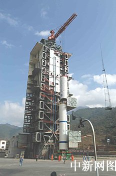 圖:"長(zhǎng)征二號(hào)丙"改進(jìn)型運(yùn)載火箭一、二級(jí)吊裝上發(fā)射塔架