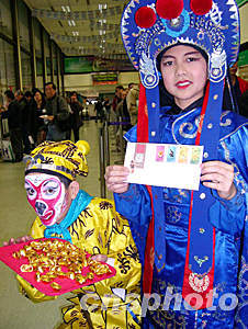 一月四日,香港郵政發(fā)行猴年特別郵票,圖為一名年僅十二歲的少年表演變臉助興,并與其父──“美猴王”向市民派發(fā)吉祥金元寶以示祝賀。作者:潘索菲
