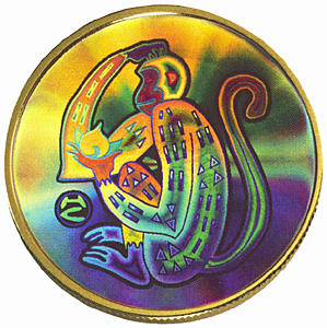 金幣18開金,激光泛彩,幣面彩色全息圖像為左手托仙桃、右手頭部抓癢蹲姿側(cè)像,表現(xiàn)了猴俏喜活潑的可愛形象。