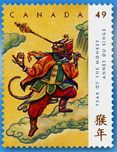 發(fā)行的2款猴年郵票取材于中國古典名著“西游記”故事中的美猴王孫悟空。面值49加分國內(nèi)郵資郵票發(fā)行量800萬張,面值1.4加元國際郵資郵票發(fā)行量170萬張。畫面分別是陪同唐僧去“西天”取經(jīng)途中手執(zhí)金箍棒騰云駕霧的孫悟空和與玉皇大帝智斗鬧天空的孫悟空。該組郵票設計者為安大略藝術(shù)學院畢業(yè)的路易斯費肖夫,他曾設計許多加拿大郵票圖案。