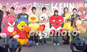 歌星梁漢文、方力申、組合Shine兩人、林嘉欣、鄭中基(左二起)1月6日在香港金鐘添馬艦舉行之《環(huán)球嘉年華2003/4》出席“Neway終極K Fun嘉年華”演唱會(huì)作表演嘉賓,獲環(huán)球嘉年華主辦機(jī)構(gòu)送上大型毛公仔。作者:鄧慶樂(lè)