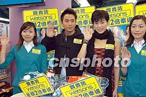 藝員胡杏兒、吳卓羲1月8日在香港出席《屈臣氏最低價(jià)保證》宣傳活動(dòng),與兩位店員共同展示最低價(jià)保證手勢(shì)。作者:鄧慶樂