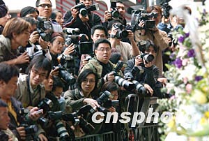 香港著名藝人梅艷芳喪禮于元月十一日設(shè)靈公祭,在香港殯儀館前大批記者報(bào)道有關(guān)梅艷芳喪禮新聞。中新社記者:錢興強(qiáng)
