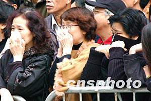 中新社香港一月十二日電(記者曉萍)患癌癥去世的香港著名藝人梅艷芳今日舉殯。大殮儀式于上午十一時(shí)開始,隨后布滿白色鮮花的靈車將靈柩送往柴灣哥連臣角火葬場(chǎng)火化。逾千名梅艷芳的歌、影迷在北角殯儀館外夾道送別,場(chǎng)面哀痛。